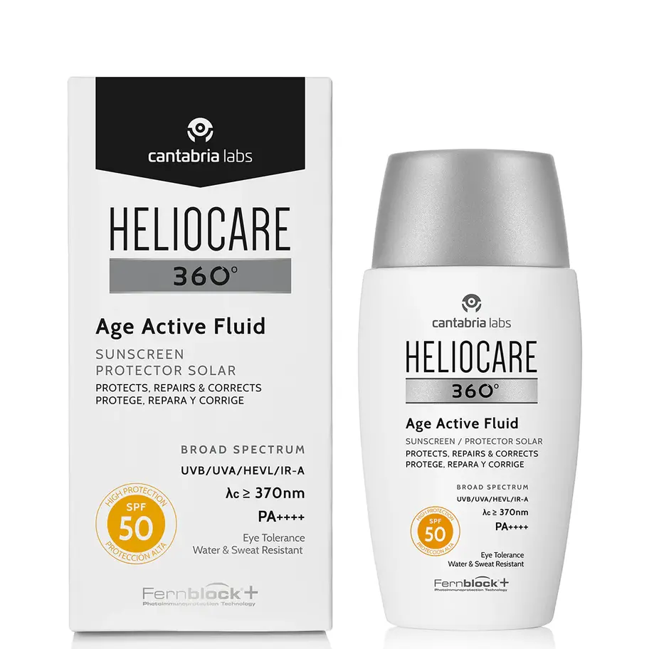 A light, hydrating fluid providing high-level broad spectrum protection plus a triple anti-ageing complex to help prevent the visible signs of ageing. The complex features a trio of hydrators to help to plump the skin and smooth lines, while an additional ‘soft focus’ complex helps to diffuse light, reducing the appearance of fine lines.. . This silky fluid also has a subtle tint, so it not only melts into the skin but also helps even the complexion.. . Heliocare 360° Age Active Fluid also features a ‘second skin’ which not only helps to lock in moisture, but also protects the skin at its surface from pollution..